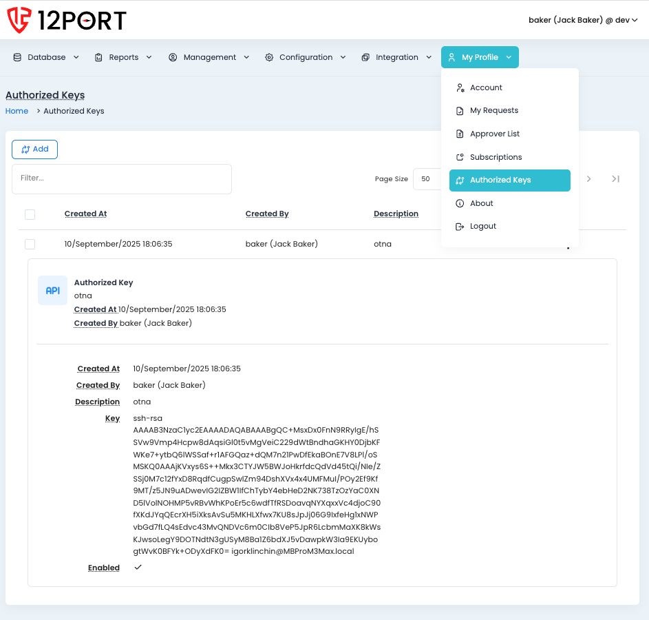 Second, upload the public key id_rsa.pub to the authorized keys management on the 12Port Server
