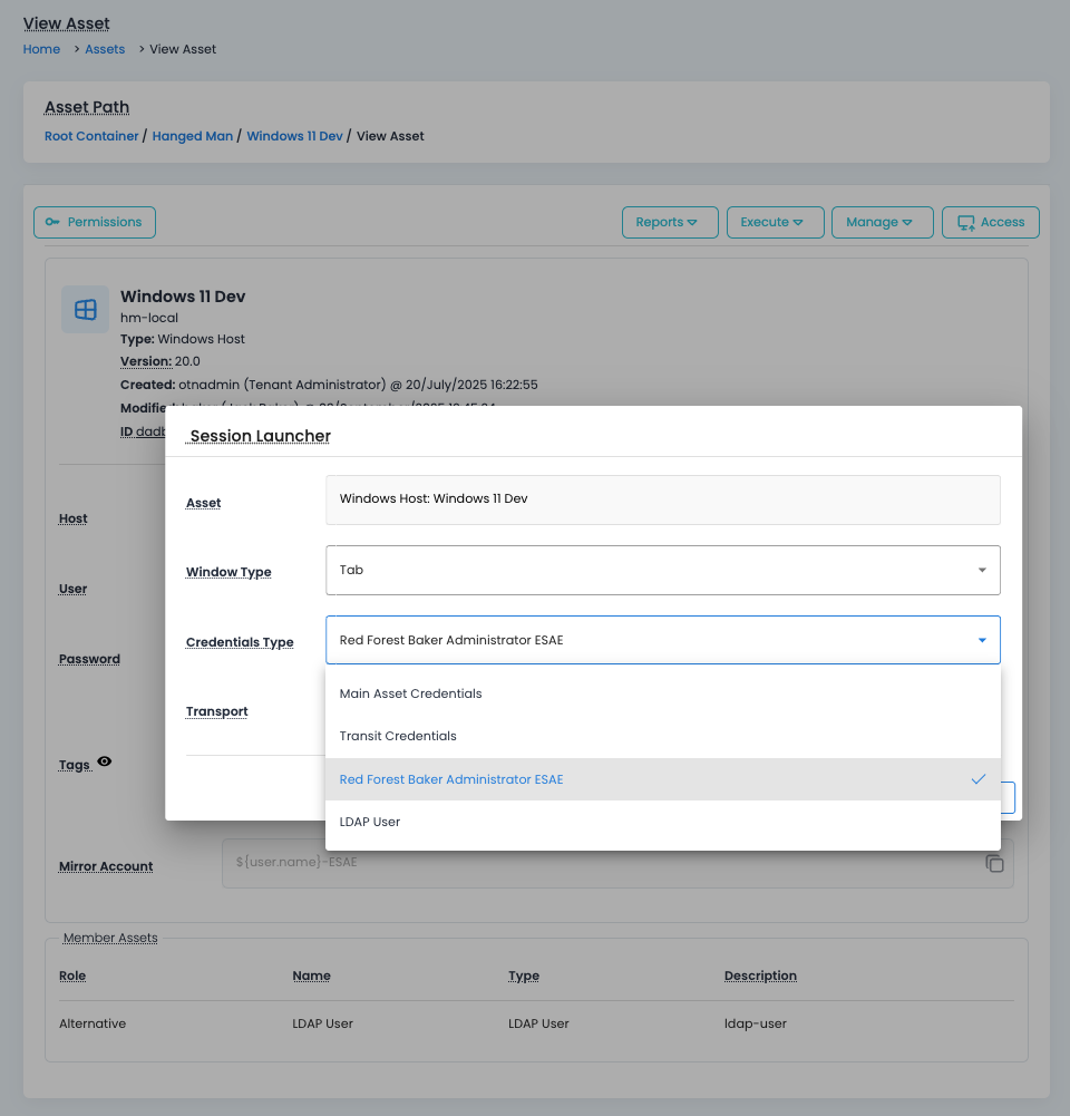 To support these scenarios, the session launcher allows a user to select a mirror account, unique for every user, when establishing WEB Session to the asset endpoint.