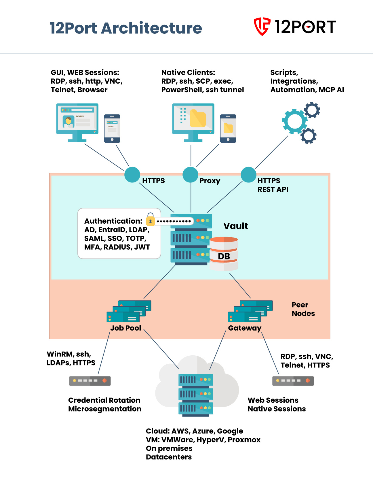 Managed Systems and Access Protocols. 12Port supports a wide range of endpoints, including Windows, Linux, Unix, IBM i servers, network devices, and web portals. These systems can be accessed using protocols such as RDP, SSH, VNC, Telnet, PowerShell/WinRM, and HTTP. This enables users to establish secure, high-trust sessions through either web-based interfaces or native third-party clients.