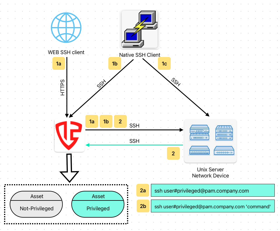 Route 1b: via the PAM SSH Proxy using a native SSH client using Not-Privileged Asset.