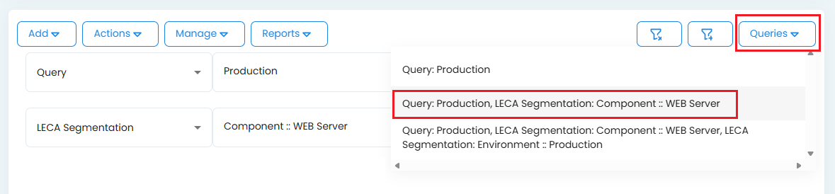 Saved queries are available from the Queries dropdown menu. Each saved entry appears under its assigned name, which is a comma-separated list of all query conditions (e.g., search condition A, search condition B).