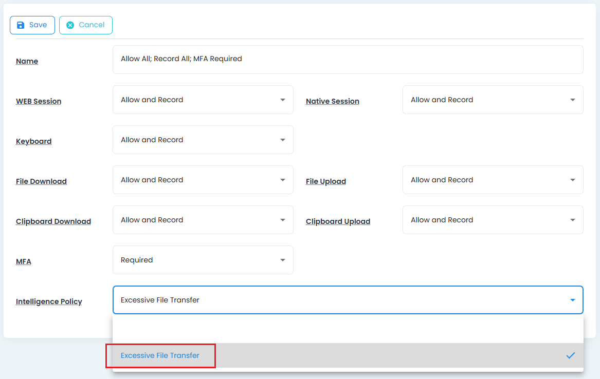 Session Intelligence policies are referenced in Access Profiles, which define user permissions and controls for accessing remote assets. By associating a Session Intelligence policy with an access profile, you can enforce behavioral monitoring and dynamic response for specific users, groups and assets.