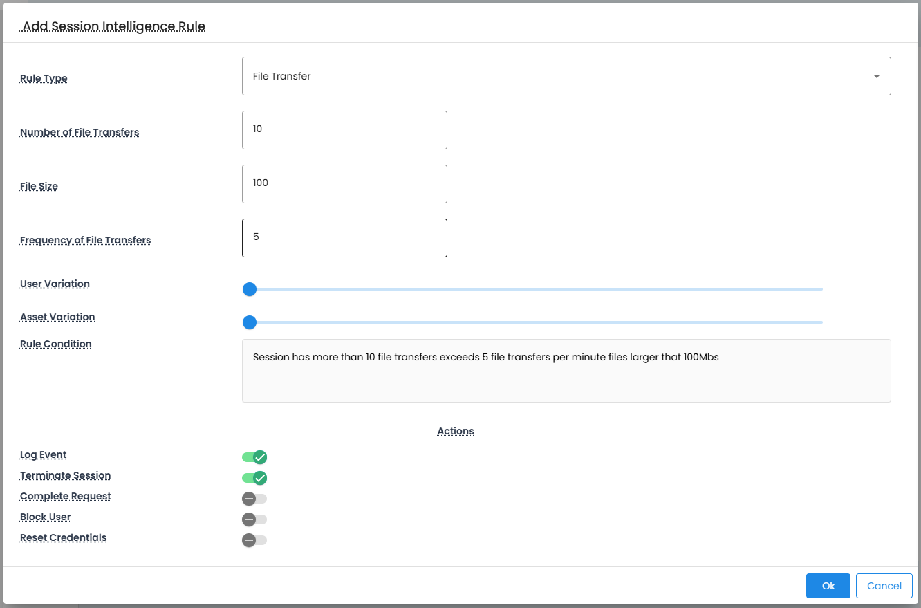 User and asset variation thresholds require historical data and are only applicable after a sufficient number of sessions have been recorded for analysis.