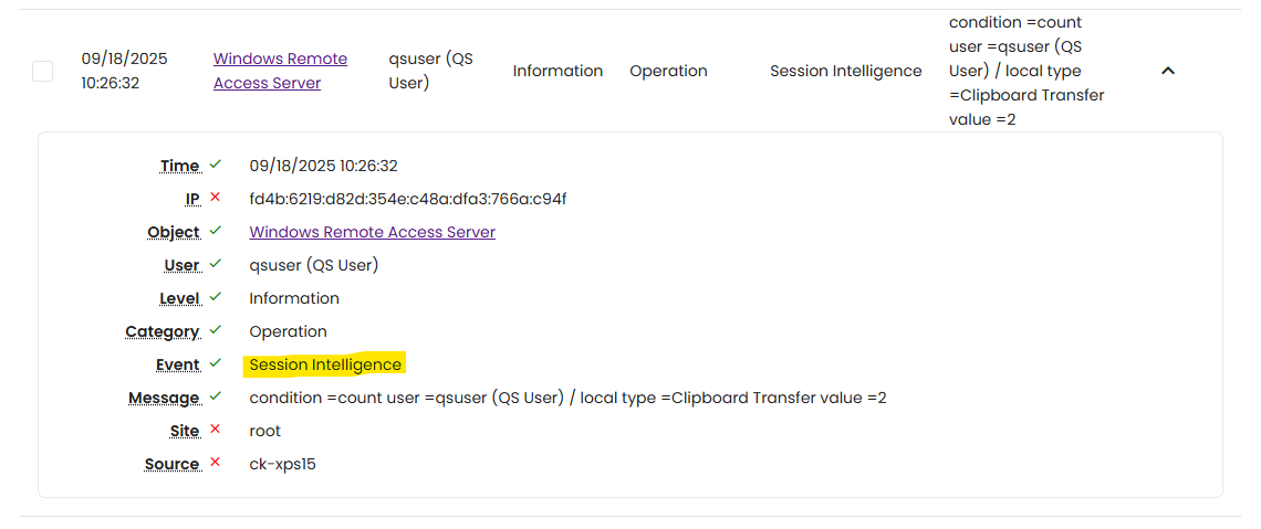Frequency of Events | Number of user events (file transfers, clipboard transfers, keyboard events) per minute. |
