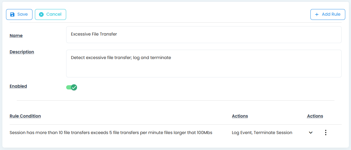 Each policy consists of one or more rules. A Session Intelligence Rule defines the monitored behavior and its associated risk thresholds, along with the actions that will be executed if the rule is triggered.