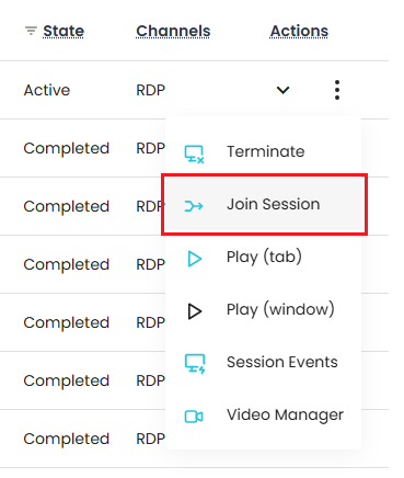 - From the Sessions Report (Site or Asset level) locate the Active session to be joined and use its Actions > Join Session option.