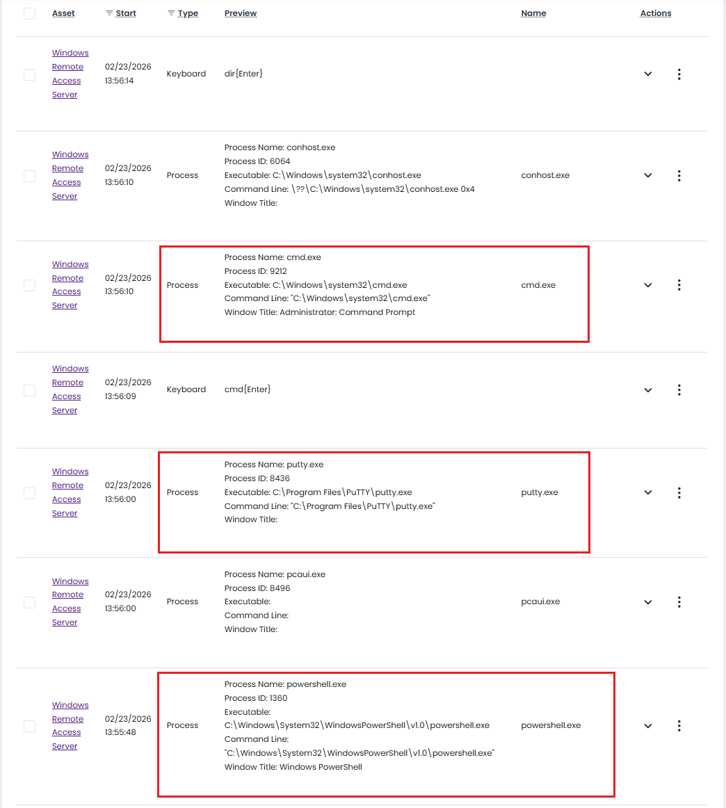 The Process Monitoring feature provides detailed monitoring and recording of Windows process activity during brokered PAM sessions, without the use of an agent. When enabled, it captures each process that starts on the target asset, including the process name, timestamp, and, where available, the application or window title. For example, if a user launches Microsoft SQL Server Management Studio (ssms.exe), opens a browser, runs PowerShell, or starts a background utility, these events are recorded as part of the user's session events.