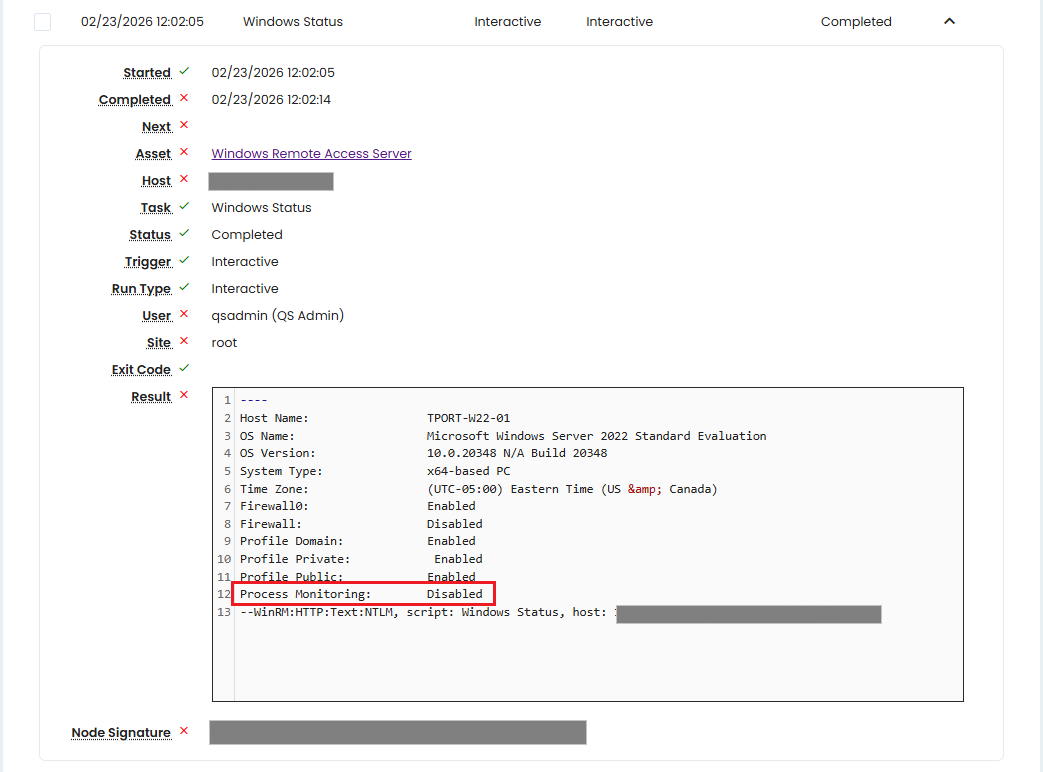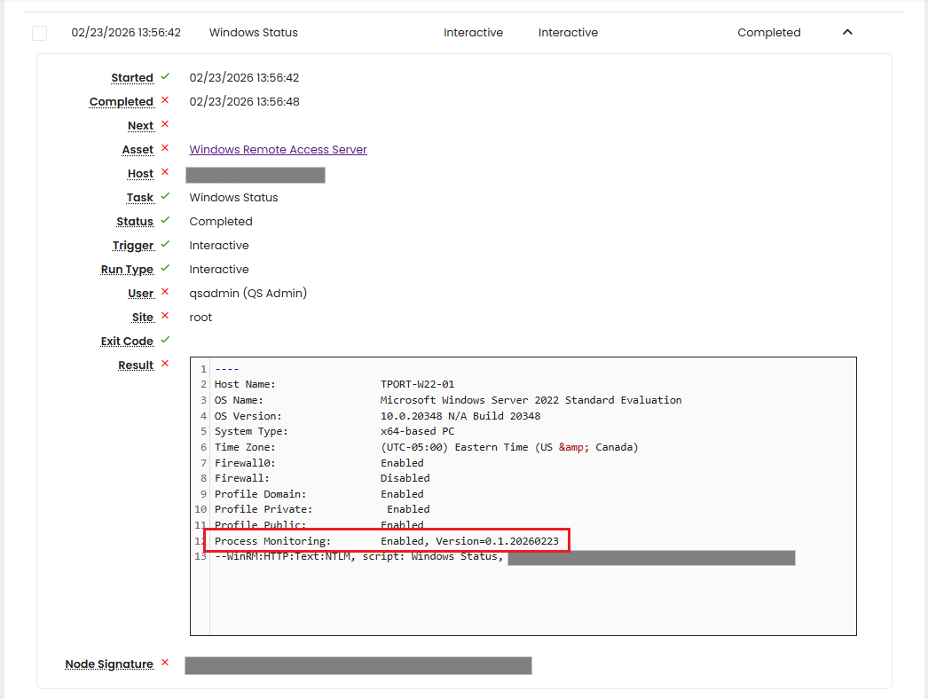 This task inspects the asset configuration and returns the current state of the monitoring auto-start command on the managed Windows Server, along with other useful host information.
