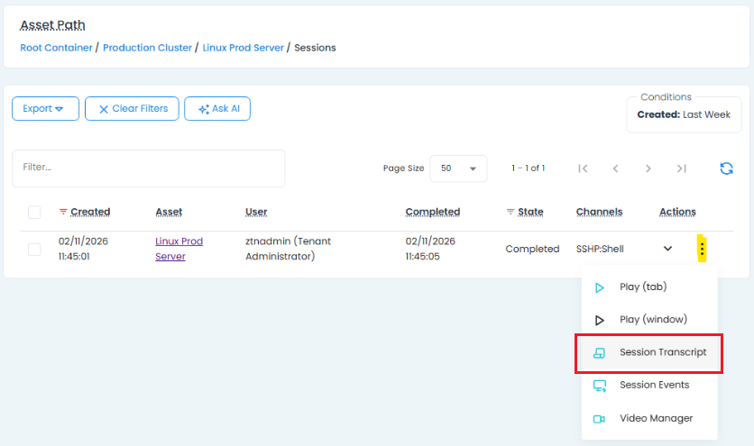 System Administrators and Auditors can access all recorded sessions via the left-hand navigation menu under Reports > Sessions. From the session list, select the desired session and choose Actions > Session Transcript.