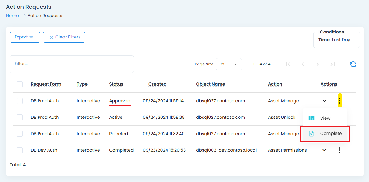 - Locate the Approved request that you wish complete and select the Actions > Complete option.