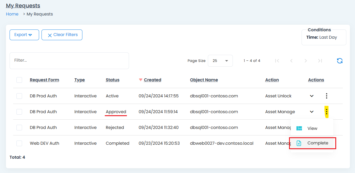 Requesters also have control to Complete and Delete their own requests if such requests are no longer required or were submitted with incorrect parameters.