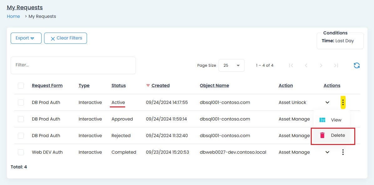 - Locate the Active request that you wish delete and select the Actions > Delete option.