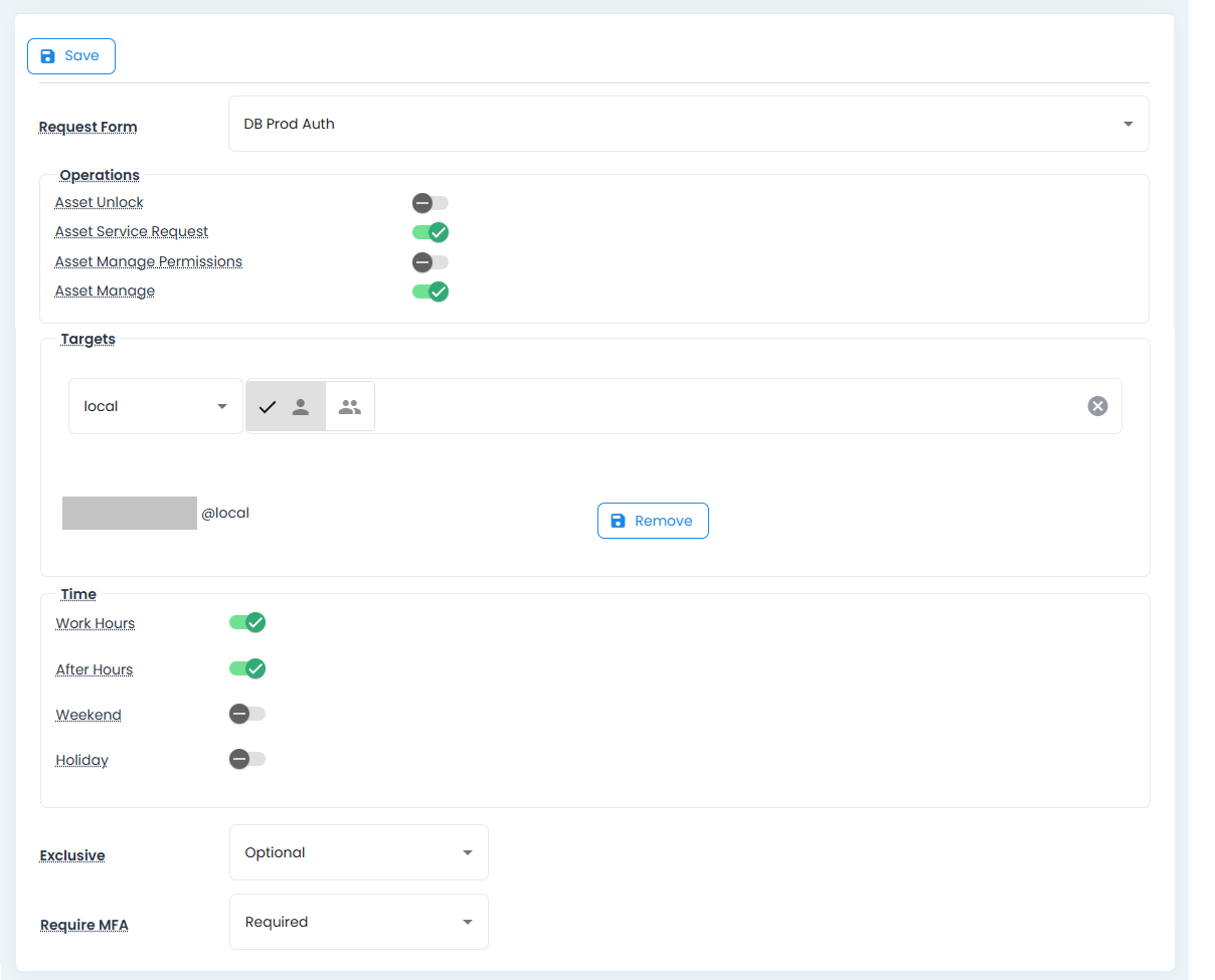 - Require MFA: Require MFA requires the user to successfully perform a MFA challenge prior to executing their request (i.e. request service access or asset unlock).