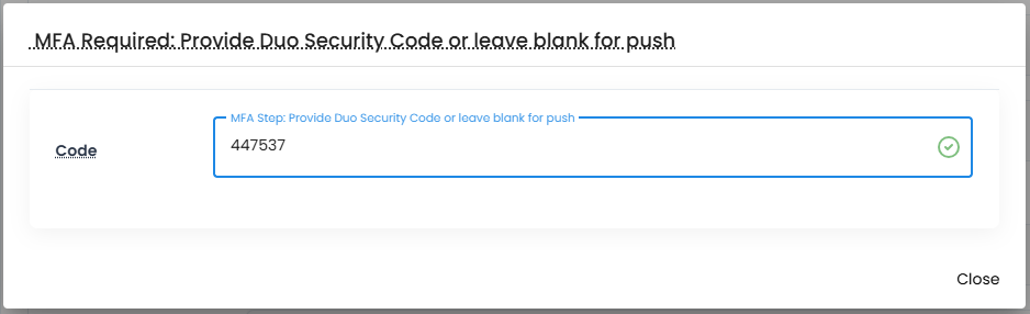 - If choosing to use Duo Push, leave the Code field blank and click the Confirm button to initiate the push notification to your Duo app. Approve the Duo Push notification to complete this MFA challenge response.