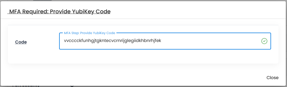 When prompted, click on the Code field to make it active then use your hardware YubiKey device to auto populate this field with a valid code.