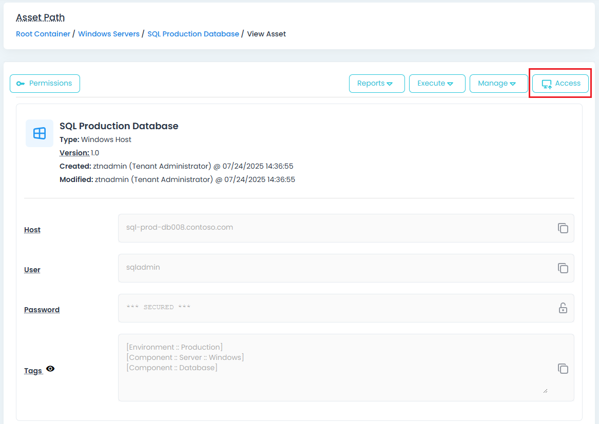 To verify the Access Profile has been applied correctly, log in as a user assigned to it, navigate to the Windows Servers container, select a child asset, and confirm the Access button is visible. Clicking Access will open the Session Launcher, where the user can review settings, enter an MFA token if required, and initiate the session.