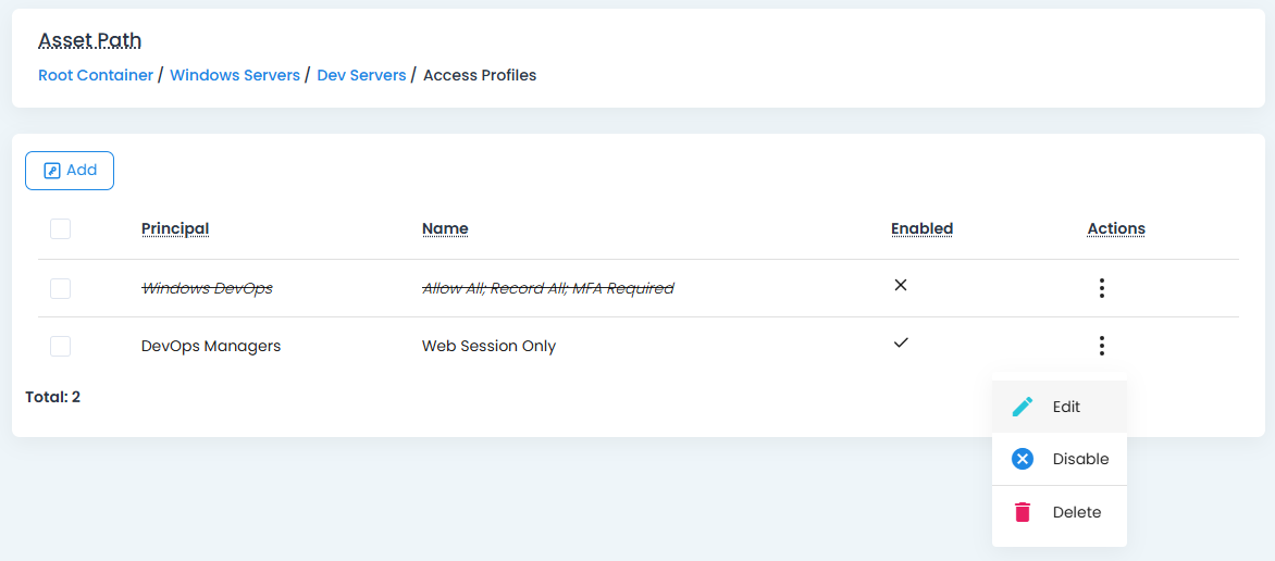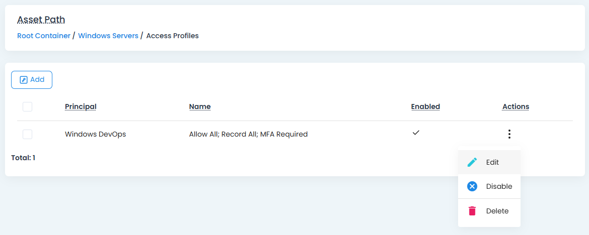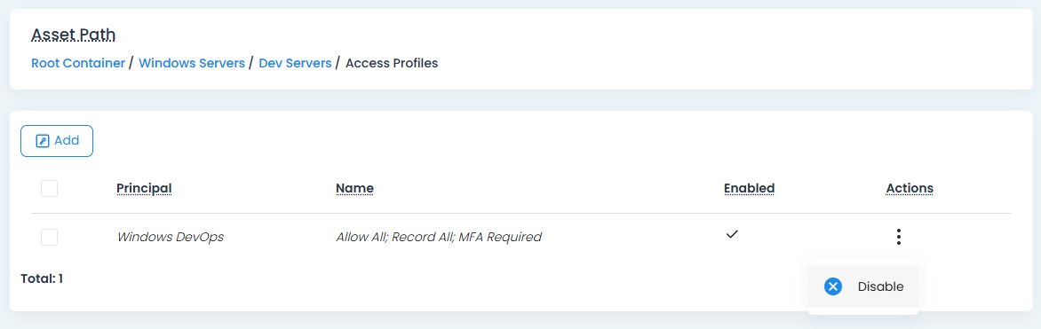 Once saved, the Access Profile appears in the asset’s Access Profiles list with a status of Enabled. You can use the Actions menu to Edit, Disable, or Delete any Access Profile directly assigned to this asset.