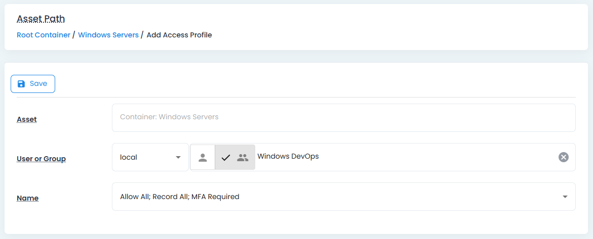 Continuing with the previous example, when viewing a child asset within the Windows Servers container, the assigned Access Profile appears in italicized font, indicating it is inherited from a parent container. Inherited profiles cannot be edited or deleted at the child level; the only available action is to Disable them. When an inherited profile is disabled, it appears with strike-through formatting, indicating it is no longer active on that specific child asset. Disabling an inherited profile prevents the assigned users or groups from accessing that asset, but it does not affect access on the parent container or other child assets where the profile remains enabled.