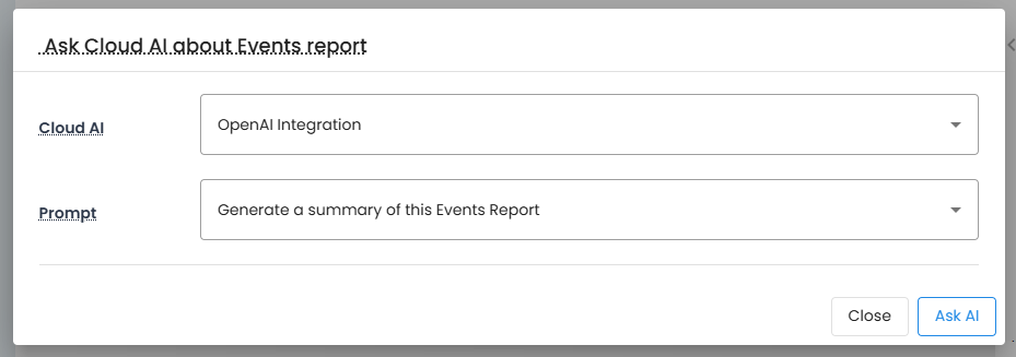 Using AI-Powered Insights involves submitting a selected report dataset to an AI service along with a predefined prompt for analysis and summarization. Supported datasets include reports such as the Events Report, where recorded event data is evaluated by the configured AI provider to generate an analytical output.
