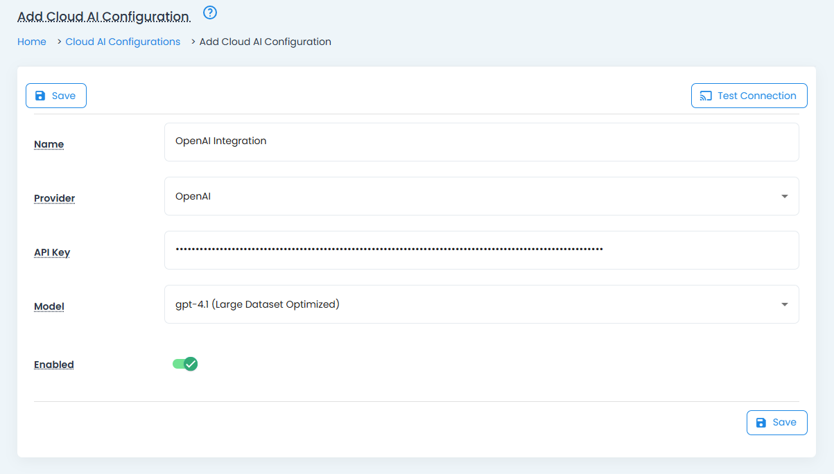 - Use the Test Connection button to confirm authentication and connectivity to the AI Cloud Provider.