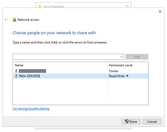 Failure to grant permissions to the computer account will result in access errors when the PAM service attempts to write recordings or file transfer logs to the network share.