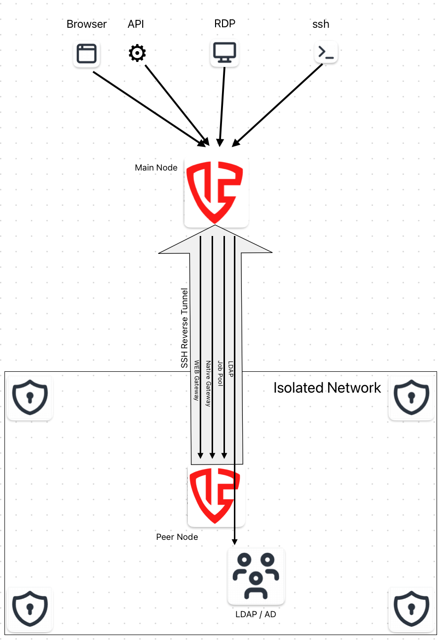 After completing the setup, the main node can interact with LDAP and Peer Node configuration in the isolated network as if they were directly connected, without opening firewall ports in the isolated network. The peer node maintains the reverse SSH tunnels that bridge this connection securely and dynamically.
